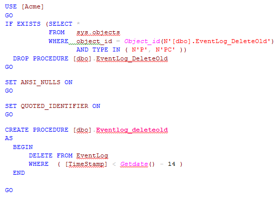 USE [Acme] GO IF EXISTS (SELECT * FROM sys.objects WHERE object_id = OBJECT_ID(N'[dbo].EventLog_DeleteOld') AND type in (N'P', N'PC')) DROP PROCEDURE [dbo].EventLog_DeleteOld GO SET ANSI_NULLS ON GO SET QUOTED_IDENTIFIER ON GO CREATE PROCEDURE [dbo].EventLog_DeleteOld AS BEGIN DELETE FROM EventLog WHERE ([TimeStamp] < GETDATE() - 14) END GO