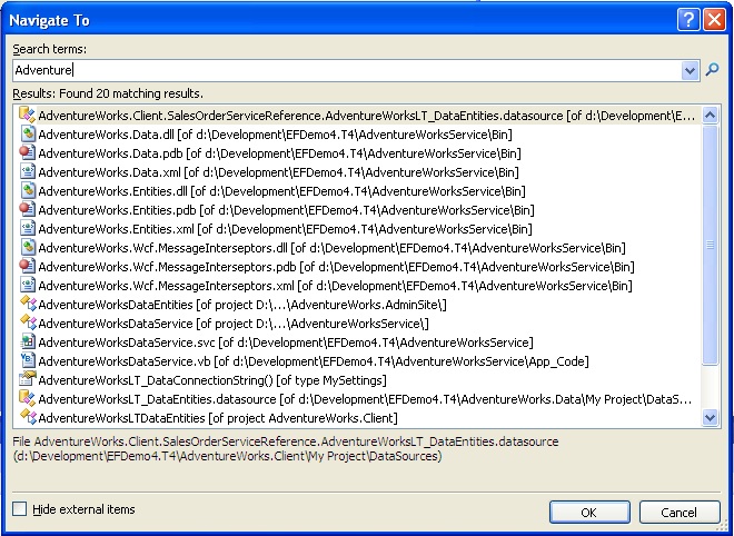 There is a new shortcut in VS2010 that makes it really simple to find any item in your solution very quick and easy. Simply type Ctrl-Comma and this dialog will appear: