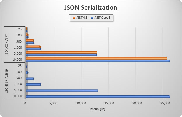 I wished that the JsonSerializer used the same simpler syntax that JsonConvert does. Let’s look at the performance results.