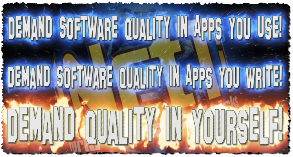 In this article, for the first time, I discuss three subjects; demand quality in apps you use, demand quality in yourself (improve skills to grow professionally), and finally demand quality in the apps you write. Demanding a certain level of quality in yourself as well as apps that you use and develop will ultimately result in important growth as a professional, resulting in higher-paying jobs. Getting paid what you are work is my goal and for that reason, I write about these subjects, along with loving what you do. Plus, users will love to use these apps and other developers will find it a pleasure to work on new features.
