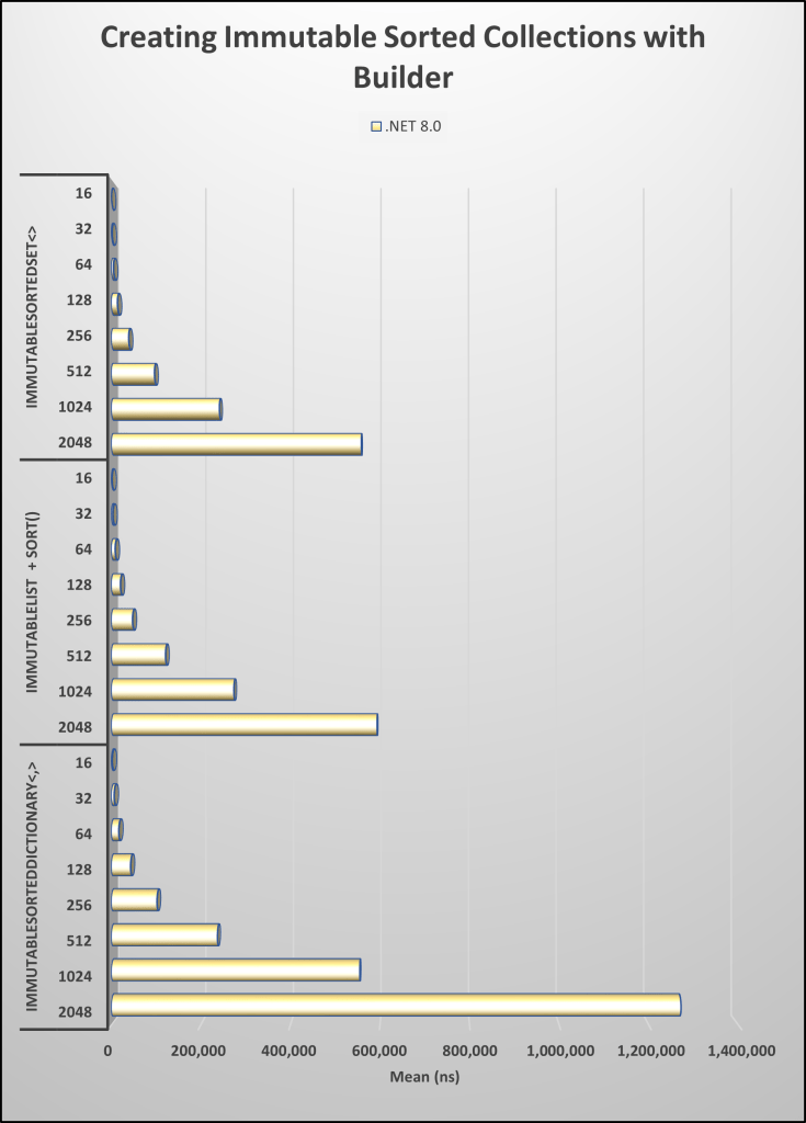 Allocations: ImmutableSortedDictionary<,>: 1,008 – 114,801 bytes. ImmutableSortedSet<>: 856 – 98,392 bytes. ImmutableList<> + Sort(): 1,808 – 213,137 bytes.