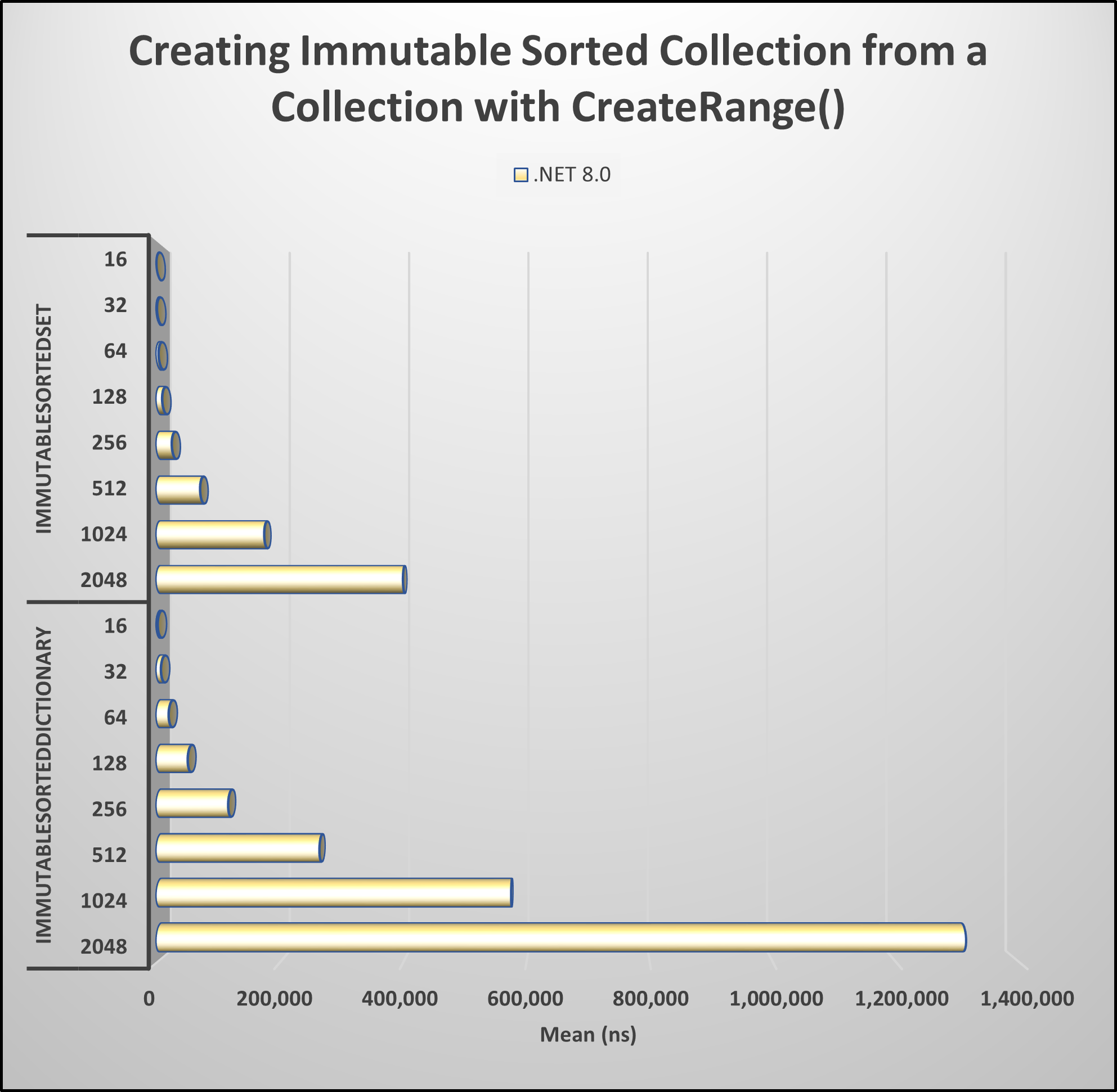 Allocations: ImmutableSortedDictionary<,>: 1,008 – 114,801 bytes. ImmutableSortedSet<>: 856 – 98,392 bytes. ImmutableList<> + Sort(): 1,808 – 213,137 bytes.