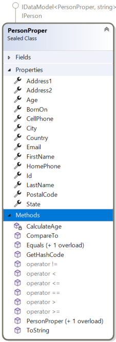 Person: This type represents how I see most model classes created for use in web API service calls or Entity Framework by implementing the properties in IPerson as auto-implemented properties.