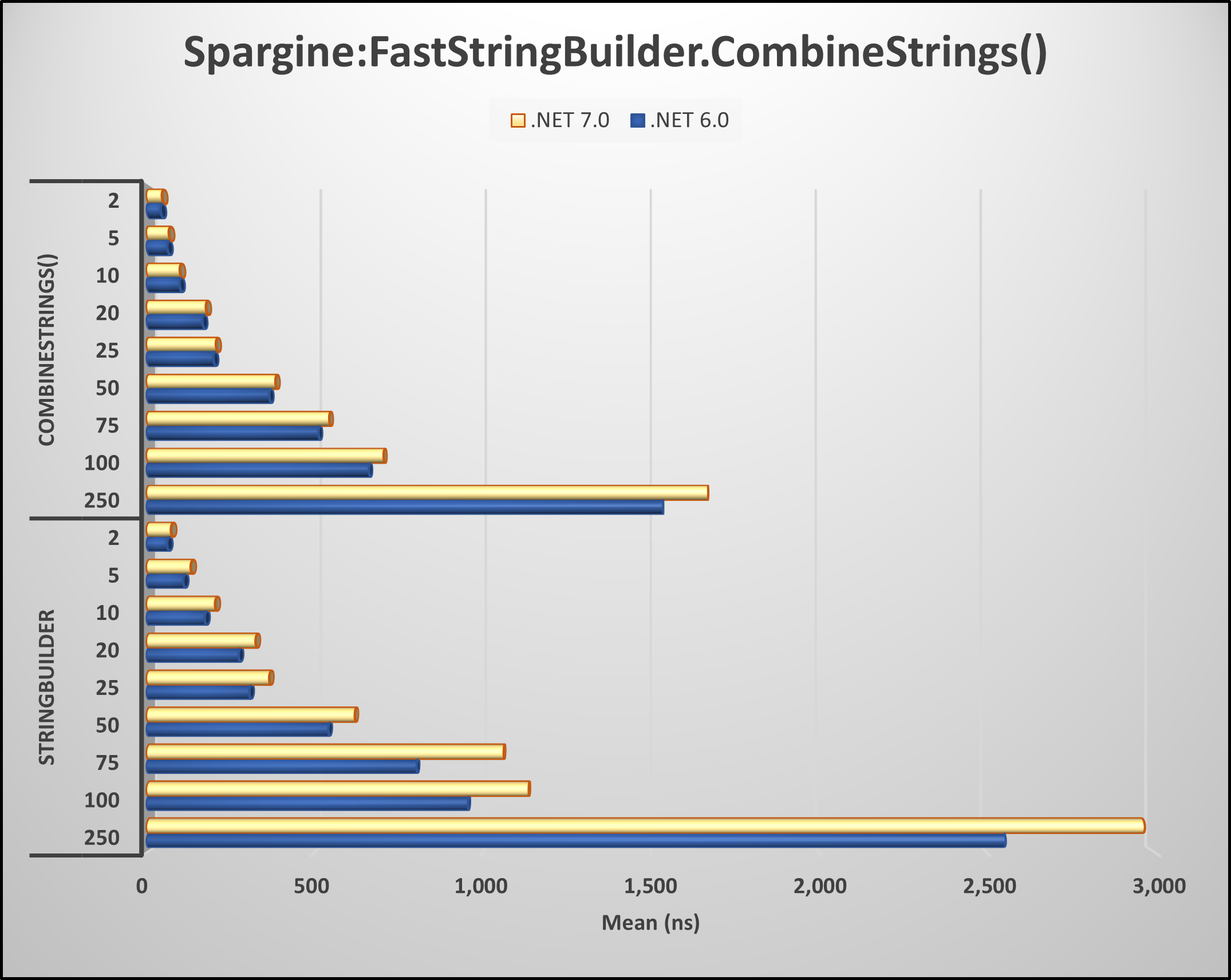 As you can see, CombineStrings() is a lot faster. It’s 1.64 times faster in .NET 7 and 1.58 times faster in .NET 6!