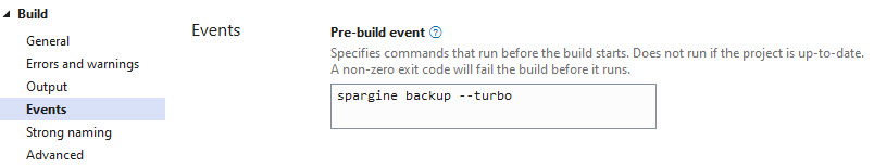 To provide an added layer of protection against source code loss, the Spargine Dev Tool now offers the convenience of being called directly from a build event in Visual Studio! Follow these steps to configure it: