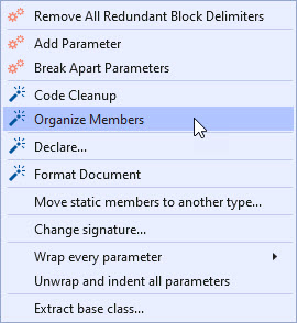 Another indispensable feature I rely on before committing code is the ability to organize the layout of class file elements. This ensures that the files are not only easy to read but also simple to modify. By default, CodeRush organizes elements according to the StyleCop standards, which aligns with the formatting guidelines I advocate in my book “Rock Your Code: Coding Standards for Microsoft .NET,” available on Amazon. You can configure CodeRush to perform this organization on each save, or you can manually trigger it by right-clicking anywhere in the file and selecting “Organize Members,” as illustrated below. This flexibility allows for seamless integration into your coding workflow.
