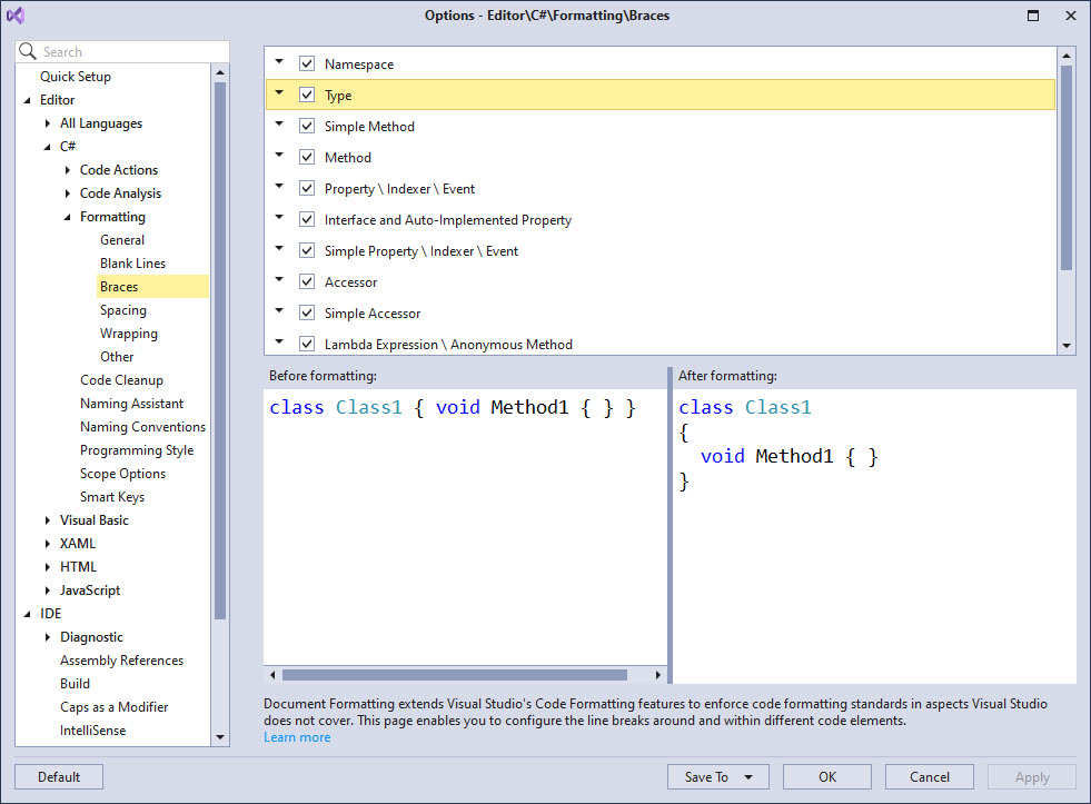 To ensure consistent formatting, you can utilize Visual Studio’s convenient feature by pressing CTRL-K, CTRL-D. Additionally, you can set up the following rules in your EditorConfig file to enforce proper formatting: