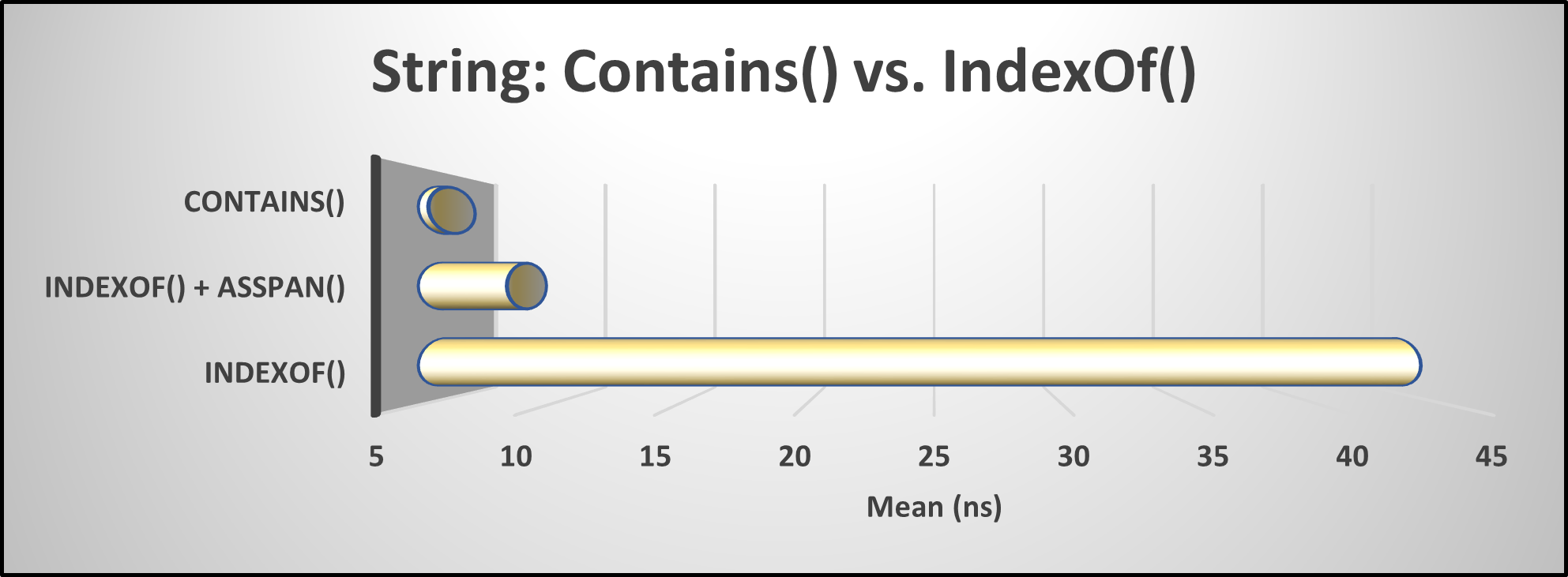 In these results, it is evident that utilizing Contains() is 1.57 times faster than employing IndexOf() with AsSpan(), and it outperforms using IndexOf() by 8.14 times in terms of speed.