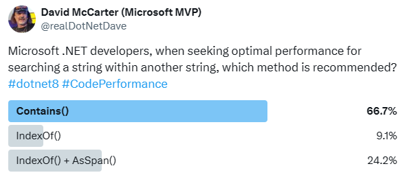 I wondered if developers were aware of the fastest method to check for a substring within a string, so I conducted a poll on Twitter.