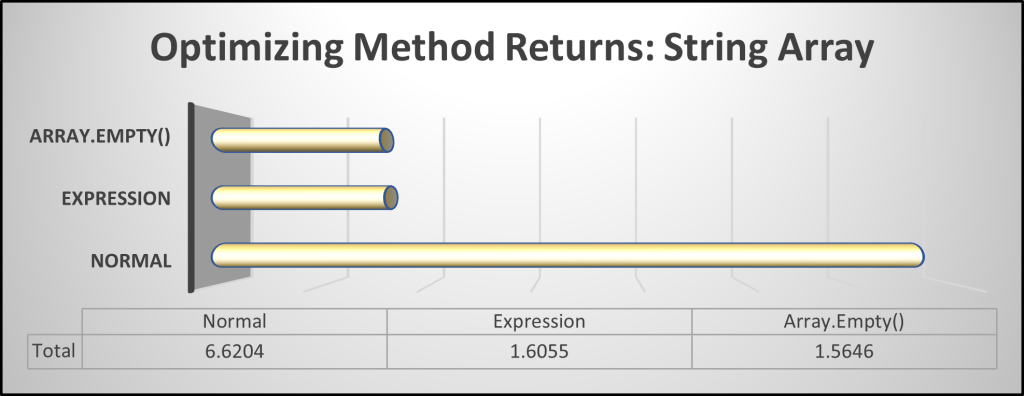 As observed, employing Array.Empty() and an expression yield nearly identical performance, whereas the conventional approach is 4.23 times slower.