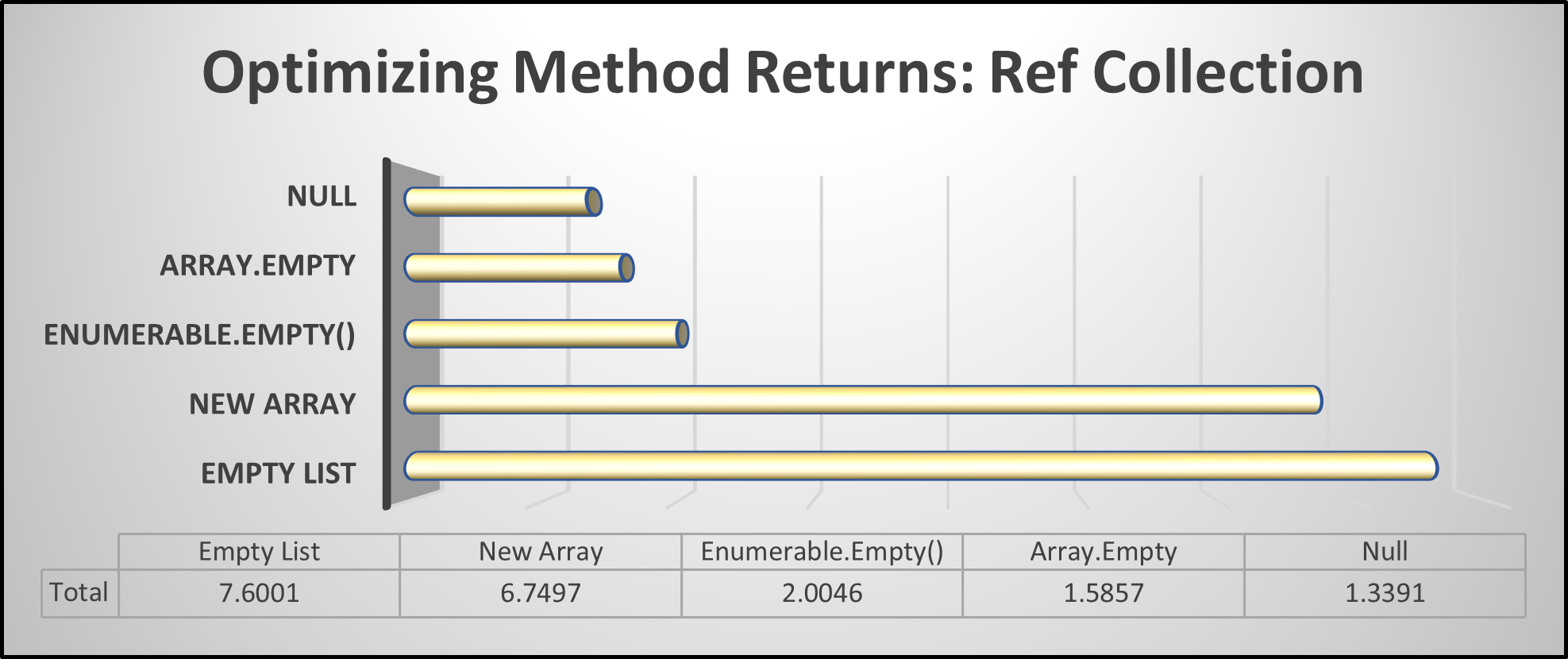 As evident from these results, returning null exhibits the best performance, yet it’s often discouraged as a common practice. Returning using Array.Empty() is 1.26 times faster than Enumerable.Empty(), 4.26 times faster than creating a new array, and 4.8 times faster than returning an empty List.