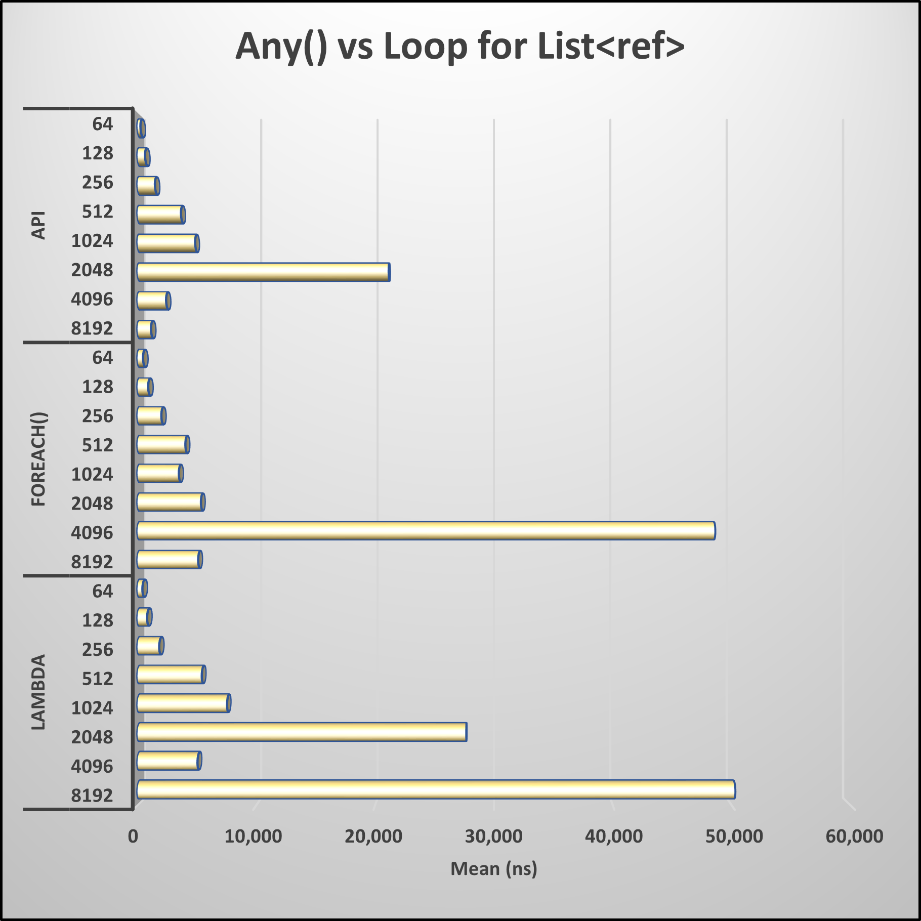 The benchmark results reveal intriguing findings. In the task of searching a collection for items matching a specified query, utilizing a traditional LINQ API demonstrates better performance. It surpasses the foreach() loop by a factor of 1.95 and outperforms the LAMBDA efficiency by 2.75 times.