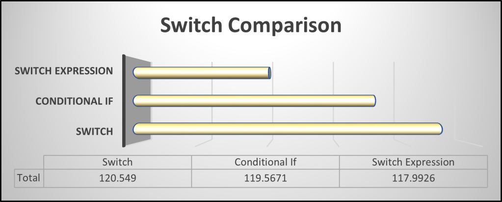Using a switch expression is more readable and requires less code. Now, let’s examine the performance.