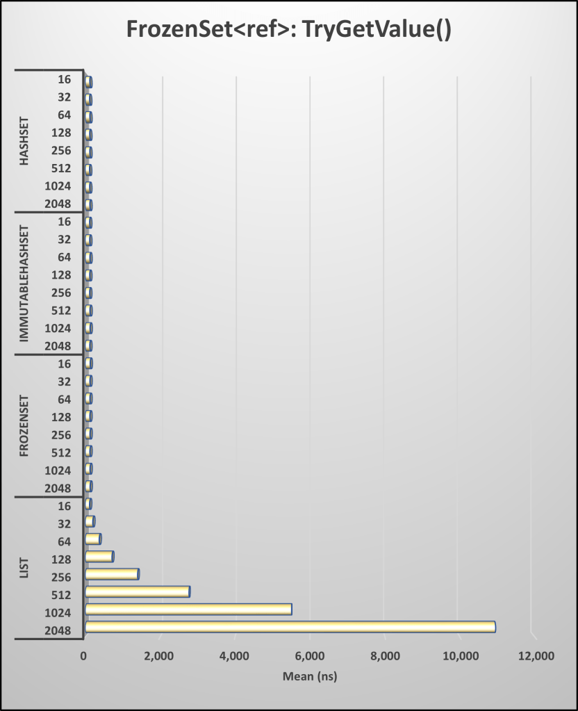 Next, let’s compare the TryGetValue() method for a FrozenSet, ImmutableHashSet, and HashSet, as well as performing a lookup in a List using a LINQ Lambda expression.