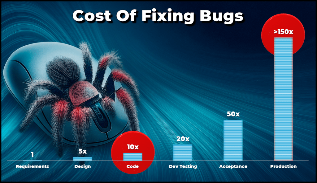 I frequently use this chart in my conference sessions, “Rock Your Code: Coding Standards for Microsoft .NET,” which highlights the cost of fixing bugs. This “money slide” shows that fixing issues discovered by engineers is ten times more expensive than catching them during the requirements phase. By the time users report issues after release, the cost can be over 150 times higher, and users may seek alternatives, leading to revenue loss.