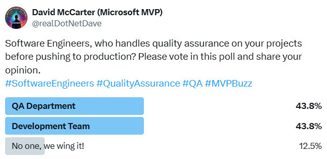 For this article, I conducted a poll on Twitter asking who handles QA on projects at work. The results show that the majority rely on the development team for testing, or, alarmingly, don’t conduct any testing at all! This is a significant issue. Over the past decade, I’ve noticed that most teams I work with don’t have a dedicated QA department. Even when they do, QA is often minimally involved, as I will discuss in this article.