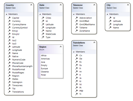 This assembly includes country, state, and city data for all countries worldwide, accessible through the CountryRepository.