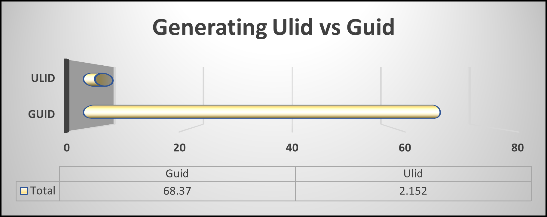 A significant advantage of ULIDs over traditional GUIDs (Globally Unique Identifiers) is speed. As demonstrated by benchmark tests, generating a ULID is 32 times faster than generating a GUID, making UlidGenerator an optimal solution for performance-critical applications.
