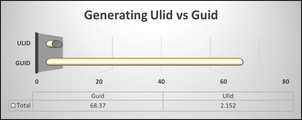 As shown in benchmark results, generating a ULID is 32 times faster than creating a GUID, making ULIDs a highly efficient choice for applications requiring fast and reliable unique identifiers.