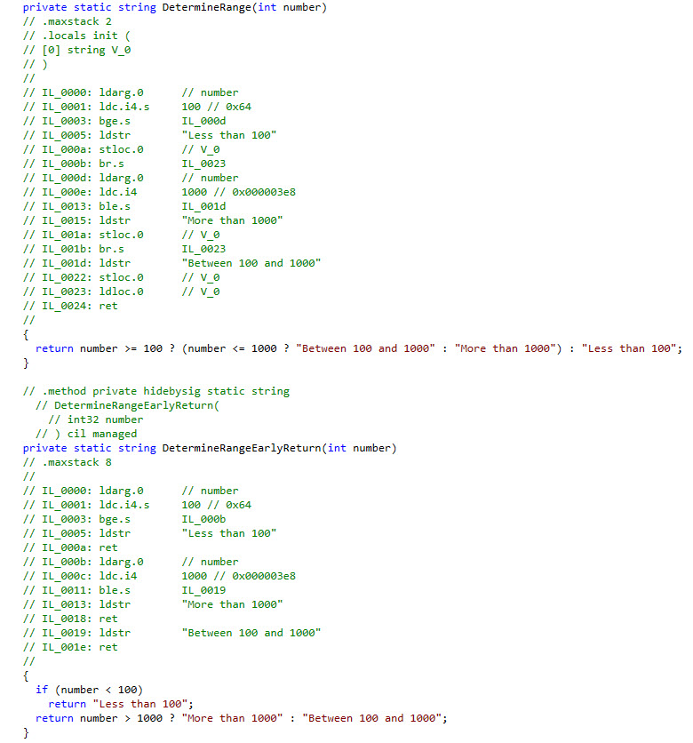 As a performance-focused developer (and author of a book on the subject), I like to make methods as fast as possible, especially in my open-source projects. I created two identical methods to test the performance difference, one using early return. Here’s the disassembly comparison of the two methods: