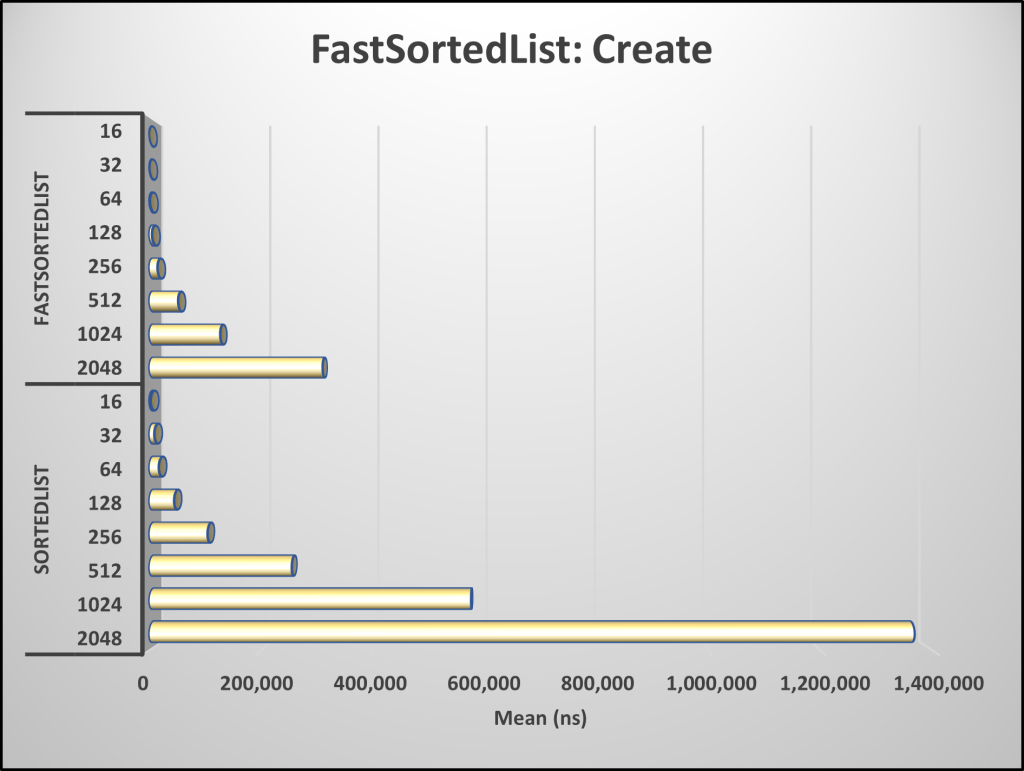 For this benchmark test, I created a new FastSortedList and SortedList and filled them with items via the constructor. For the FastSortedList, I also called Sort() after the collection was created. As you can see from these results, FastSortedList is 4.61 times faster than SortedList and allocates about half of the memory used to make the collection.