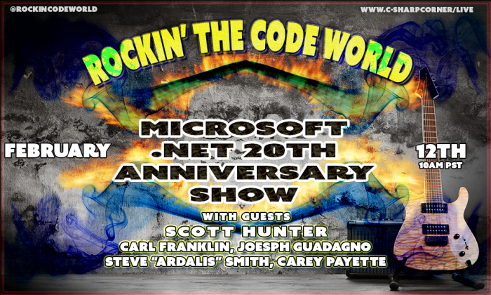 Join me live on Saturday, February 12th at 10:00 PST on C# Corner Live for show #48 for a very special panel show to celebrate the 20th anniversary of Microsoft .NET.