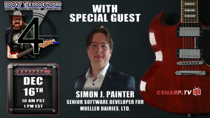 Join the 93rd show on C# Corner TV on December 16th, 2023, featuring Simon Painter, Senior Software Developer for Mueller Dairies, Ltd. The show includes an extensive interview with Painter, discussions on functional programming in C#.