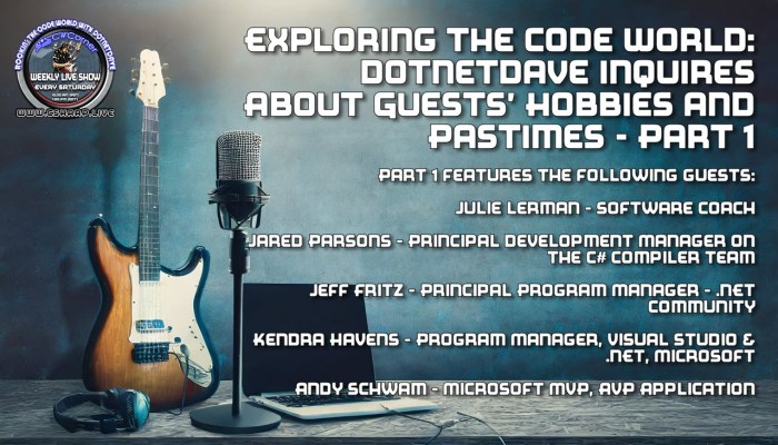 Exploring the Code World: dotNetDave Inquires About Guests’ Hobbies and Pastimes - Part 1 delves into the personal interests and leisure activities of prominent figures in the coding community. In each episode of "Rockin' the Code World with dotNetDave," guests are questioned about their hobbies beyond coding, emphasizing the importance of incorporating enjoyment into the lives of software engineers. Part 1 features insights from guests such as Julie Lerman, Jared Parsons, Jeff Fritz, Kendra Havens, and Andy Schwam, shedding light on the diverse interests that complement their coding expertise.
