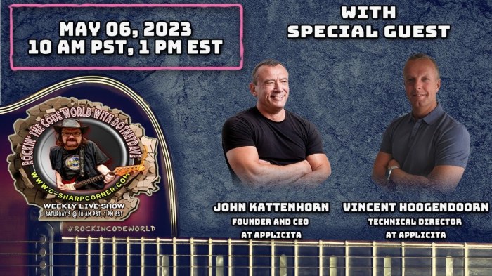 Join me on Saturday, May 6th, 2023, at 10:00 PST on C# Corner for show #79 where, for the first time, my special guest will be John Kattenhorn, Founder and CEO at Applicita. Don't miss this episode!
