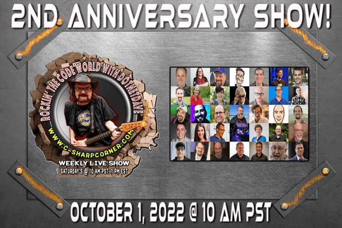 Join me live for the 2nd-anniversary show on Saturday, October 1st, 2022 at 10:00 PST on C# Corner Live, show #67! Join us as we geek out and talk all things programming and the show of course.