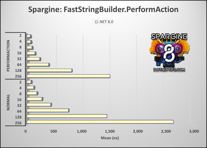 This article explores the optimization of string processing in collections through the integration of the PerformAction() method in Spargine and FastStringBuilder. Demonstrating a 1.79-fold performance increase and reduced memory allocation, the method proves to be a valuable tool for developers seeking enhanced efficiency in string manipulation.