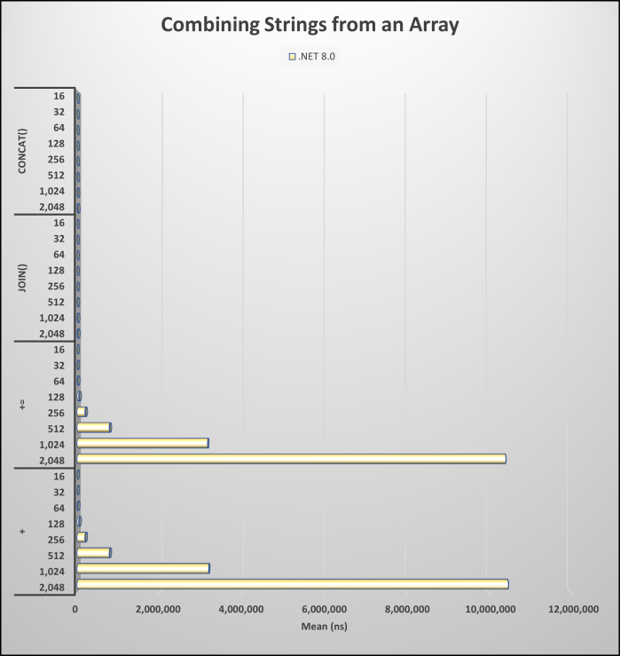 In .NET, string concatenation should be approached carefully due to immutability. Using Concat() or Join() for combining strings from an array is advised for better performance and memory allocation. Avoid using += or + as they lead to significant performance decline and larger memory allocations. StringBuilder can also enhance performance.